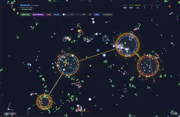 SocioLife evolves intelligent agents with DNA that evolve and interact, forming complex societies that then engage in economic, diplomatic, and military relations.… Read More “SocioLife – A Socio-Economic Artificial Life Sim That Runs in your Browser”